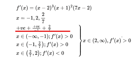 Since, the sign of f'(x) is changing from +ve to -ve at x=2/7. Hence, f(x) is maximum at x=2/7. It is changing -ve to +ve at x=2. Therefore, it is minimum at x=2. There is no change in singn at x=-1. Therefore, x=-1 is point of inflexion.
