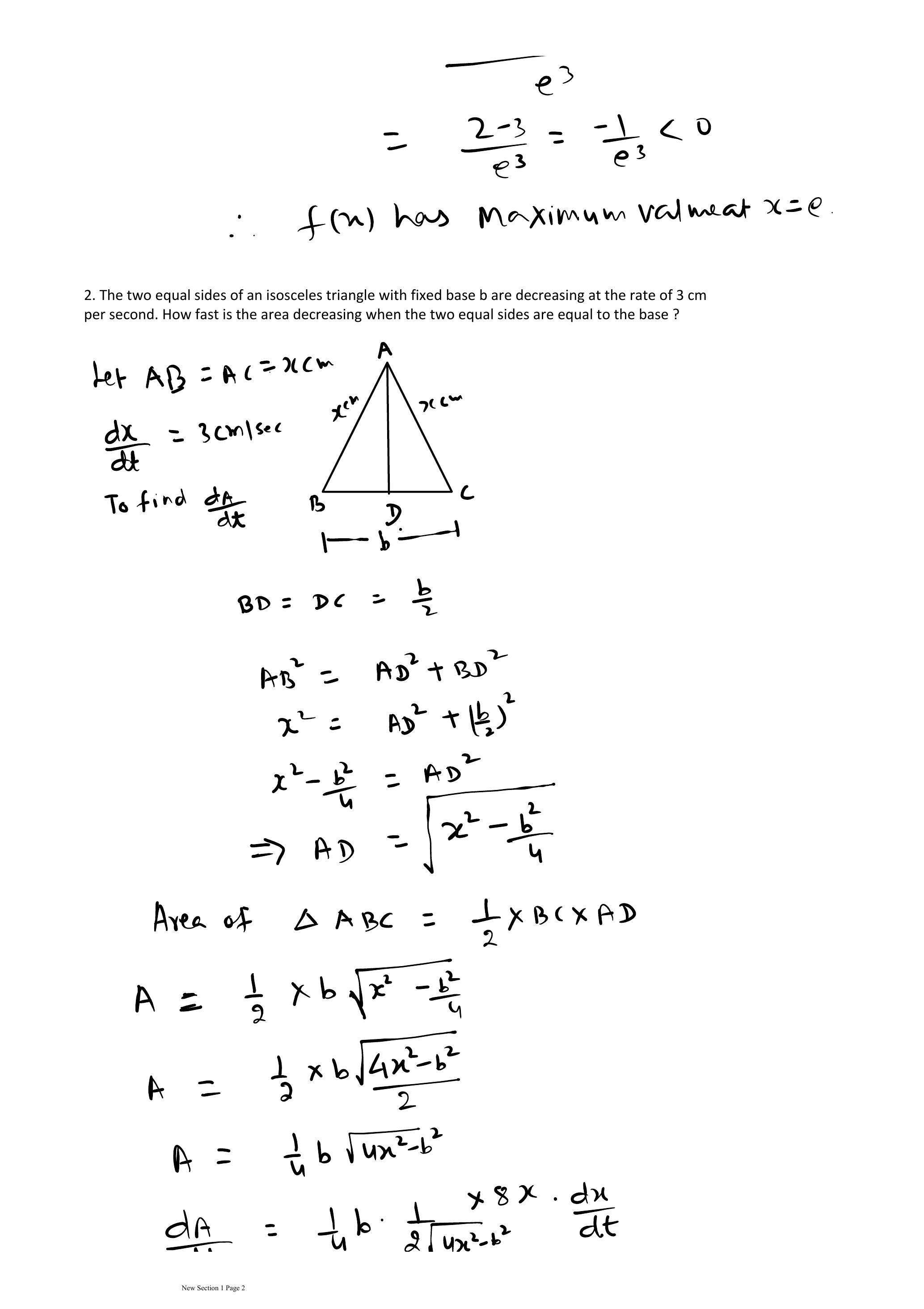 Q. 2. The two equal sides of an isosceles triangle with fixed base ‘b’ are decreasing at the rate of 3 cm per second. How fast is the area decreasing when the two equal sides are equal to the base ?